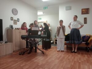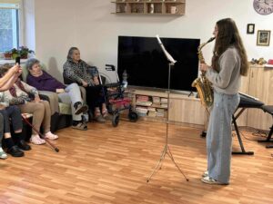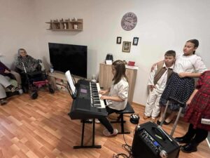 Program otvorili žiaci hudobného odboru, ktorí predviedli pestrú paletu skladieb – od ľudových piesní, cez známe melódie až po jednoduché moderné aranžmány. Ich vystúpenia boli sprevádzané srdečným potleskom, ktorý prezrádzal, že hudba si okamžite našla cestu k poslucháčom. O to veselšiu atmosféru priniesli mladšie žiačky tanečného odboru. Predviedli jednu energickú, veselú choreografiu, ktorá rozžiarila celú miestnosť. Ich spontánnosť a radosť z tanca strhli aj obyvateľov domova – tí sa v rámci svojich možností ochotne pridali a spolu s deťmi vytvorili krásny moment plný úsmevov a spoločného pohybu.