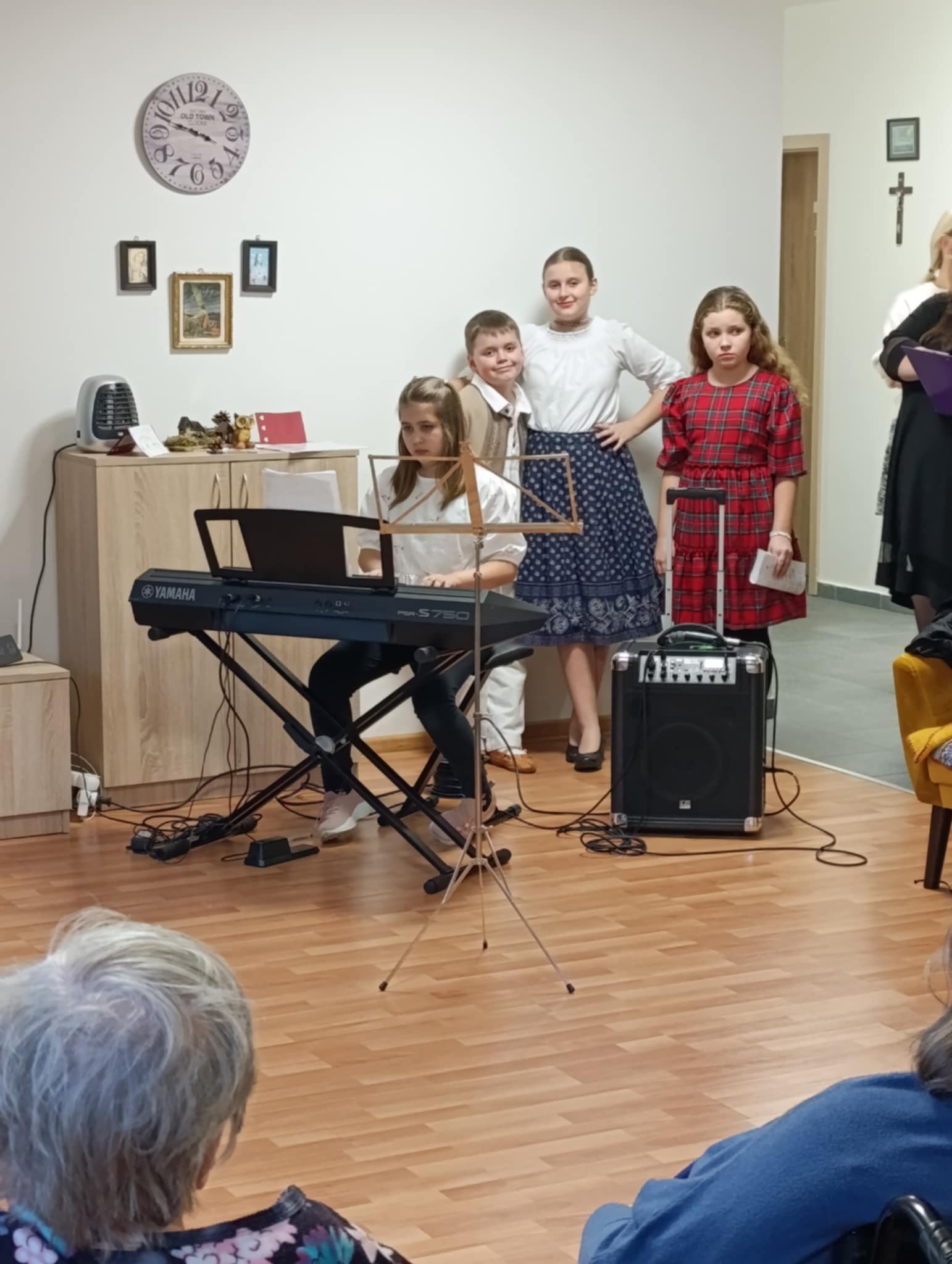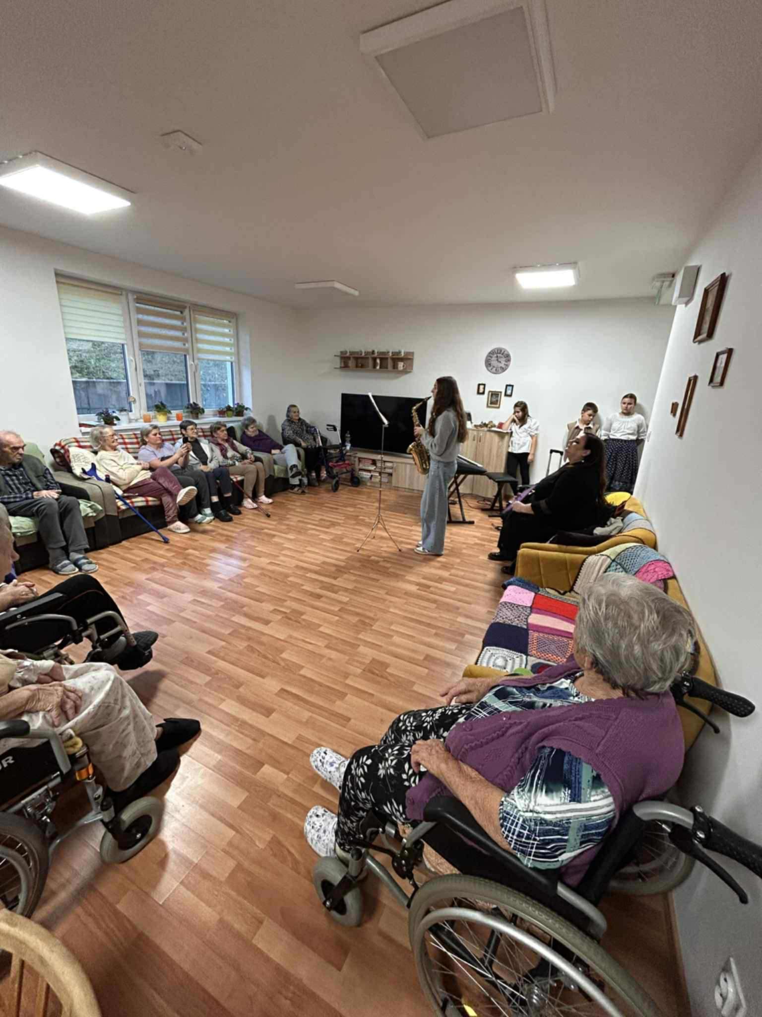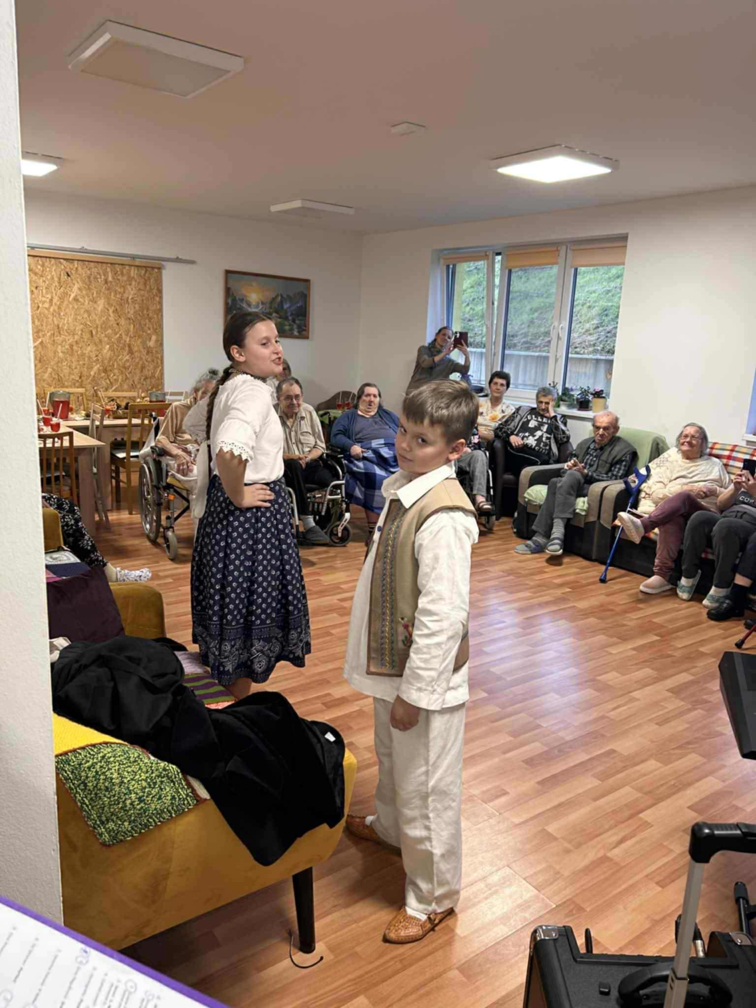 Program otvorili žiaci hudobného odboru, ktorí predviedli pestrú paletu skladieb – od ľudových piesní, cez známe melódie až po jednoduché moderné aranžmány. Ich vystúpenia boli sprevádzané srdečným potleskom, ktorý prezrádzal, že hudba si okamžite našla cestu k poslucháčom. O to veselšiu atmosféru priniesli mladšie žiačky tanečného odboru. Predviedli jednu energickú, veselú choreografiu, ktorá rozžiarila celú miestnosť. Ich spontánnosť a radosť z tanca strhli aj obyvateľov domova – tí sa v rámci svojich možností ochotne pridali a spolu s deťmi vytvorili krásny moment plný úsmevov a spoločného pohybu.